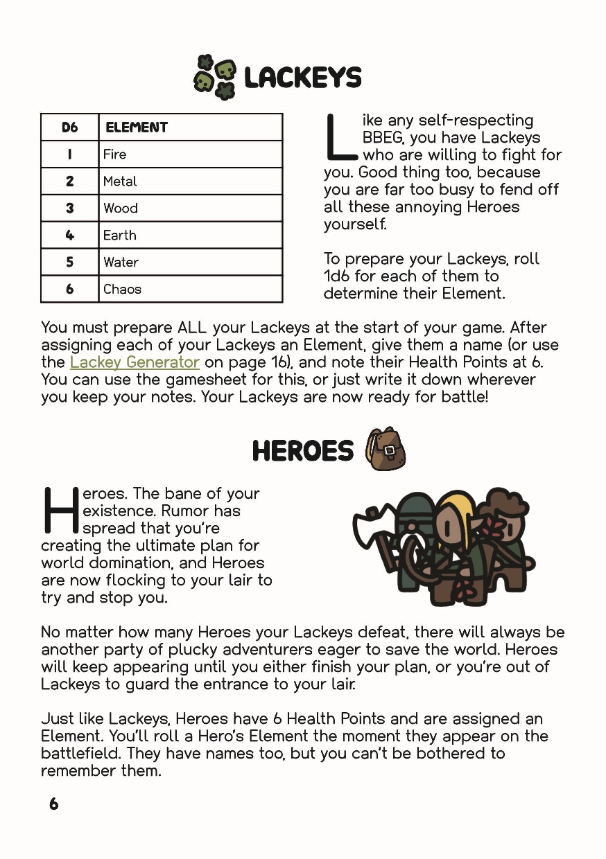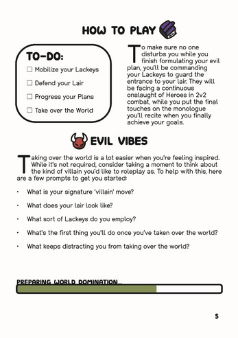 It’s been a while since you graduated from BBEG University, but all you’ve got to show for it so far is a pile of half-finished plans. No armies of undead. No summoning of Eldritch deities. Not even a crocodile moat to protect your evil lair. Meanwhile all your BBEG peers have already made world domination attempts, and some of them have even made mortal enemies! If you don’t come up with something soon, you’ll definitely be the laughing stock of the villain reunion. Again.